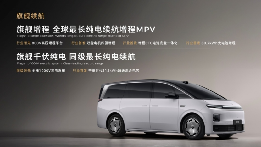 配置方面,官方宣称该车为全球最长纯电续航增程 MPV,行业领先 800V 高压增程平台、行业首发增程 CTC 电池底盘一体化、行业首发双能电机四驱增程、行业首发 80.3kWh 大电池增程。此外,该车还提供纯电版本,配备同级领先全栈 1000V 三电系统、行业首发宁德时代 115kWh 超级混合电芯。