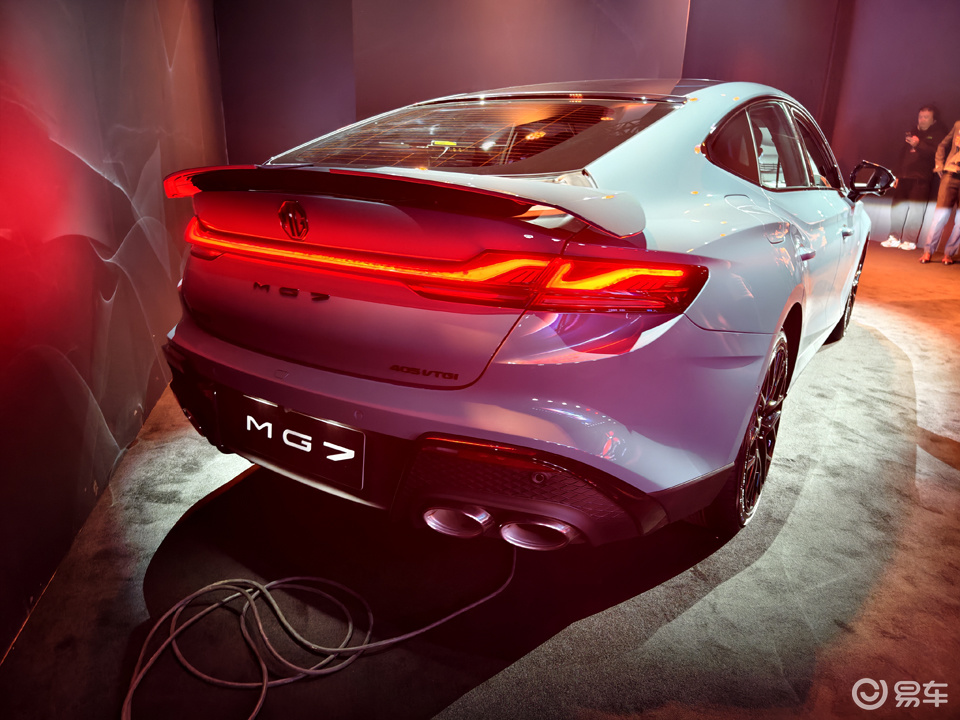 车身侧面采用了经典的Fastback溜背式设计,车顶线条从A柱末端开始自然下滑,流畅地延伸至车尾,形成优雅且动感的轿跑轮廓。上扬的肩线从前翼子板贯穿至车尾,与车门下方上提的筋线相互呼应,共同勾勒出车身侧面的层次感和肌肉感,静态下也呈现出一种蓄势待发的姿态。无边框车门的设计进一步强化了其运动属性,全新的19英寸多辐式轮毂,造型更具运动感,高配版本还采用了熏黑处理并搭配红色刹车卡钳,视觉效果更加出众。色彩方面,此次新款MG7新增了冰岛蓝,并且内饰也采用了对应的色彩。