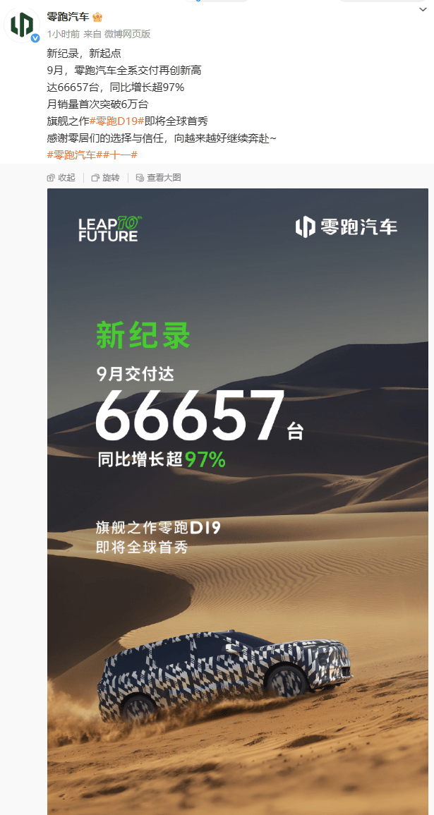 10月1日,零跑汽车宣布9月全系交付再创新高,交付量达到66657台,同比增长超97%,月销量首次突破6万台。
