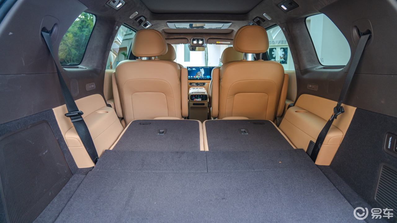 深蓝S09的二排还有很值得说的一点,市面上有些5米多的中大型SUV车型,在放倒第三排后,第二排是不能当大四座使用的,因为靠背会被第三排挡住。但深蓝S09放倒第三排后,第二排座椅依然可以保持非常仰躺的姿势。