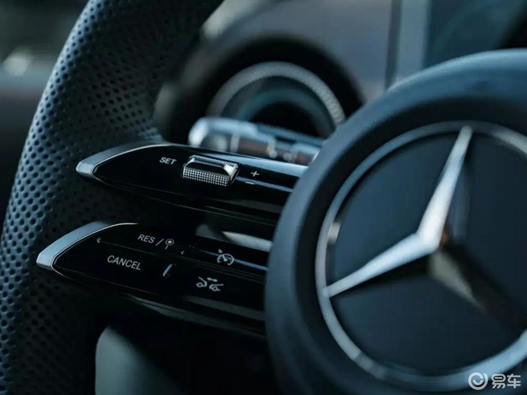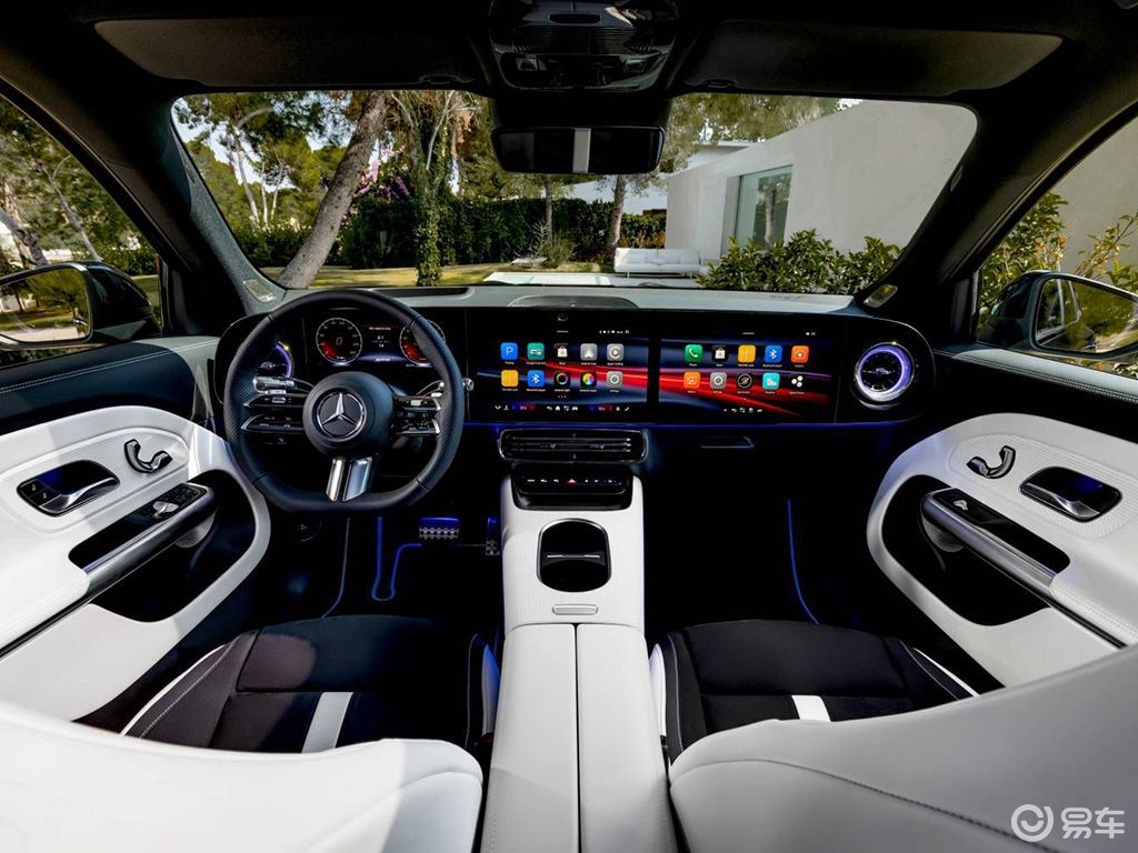 内饰变化挺大,换装了一整块的奔驰超级屏幕。其由10.25英寸全液晶仪表(显示车速、续航等行车数据)、14英寸中控屏(控制导航、空调、娱乐等功能)、14英寸副驾娱乐屏(供副驾观看影视、操作娱乐应用)所组成,整个内饰旨在减少物理按键,以提升座舱科技化气息。