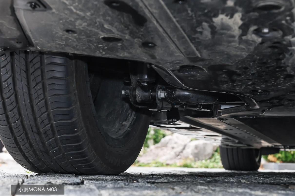 小鹏M03毕竟是一台A级车,所以它除了采用前置前驱布局外,选择的悬架组合是前桥麦弗逊式独立悬架+后桥扭力梁式非独立悬架。后者对空间倒是有好处的,加上它的低风阻车身设计,在日常驾驶中表现得较为平稳,但遇到连续弯道就要吃力一些。要是三五好友出游,二排的舒适体验也会稍打折扣。