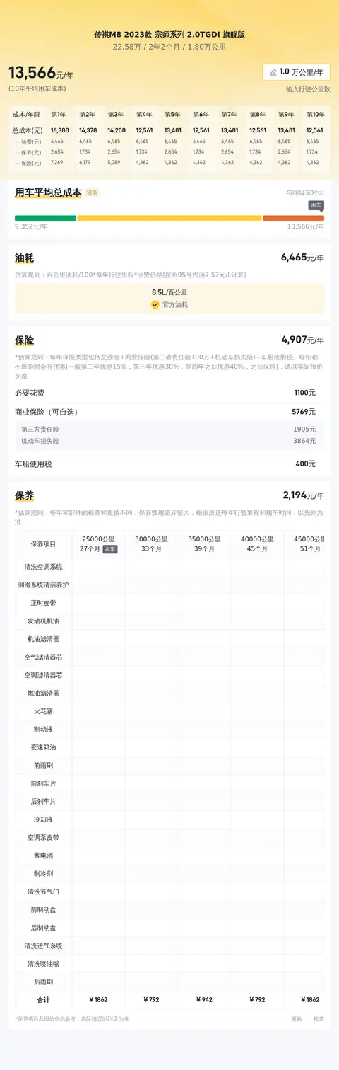 养车成本方面,按一年20000公里计算,该型车每年燃油、保险及保养的综合用车成本约13554元,具体费用要看用车频率及使用环境而定。