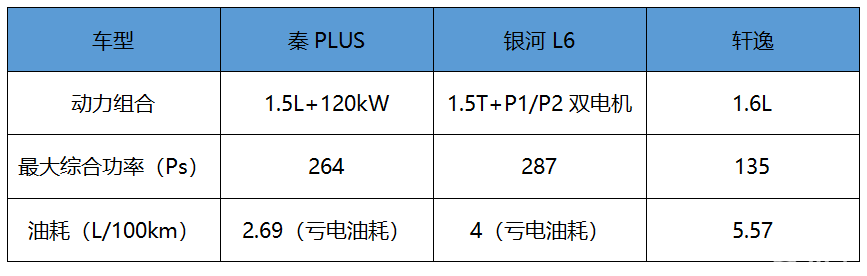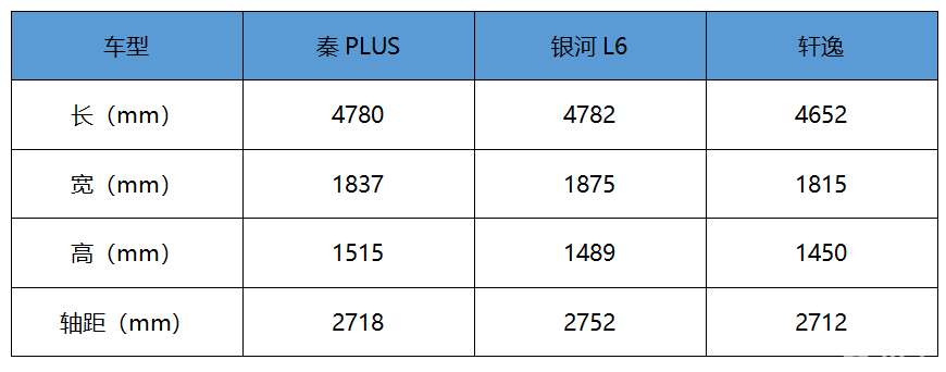 银河L6长宽高分别为4782、1875、1489mm,轴距2752mm,相比秦PLUS DM-i,银河L6轴距更长,车身更宽,在后排乘坐空间上更具优势。