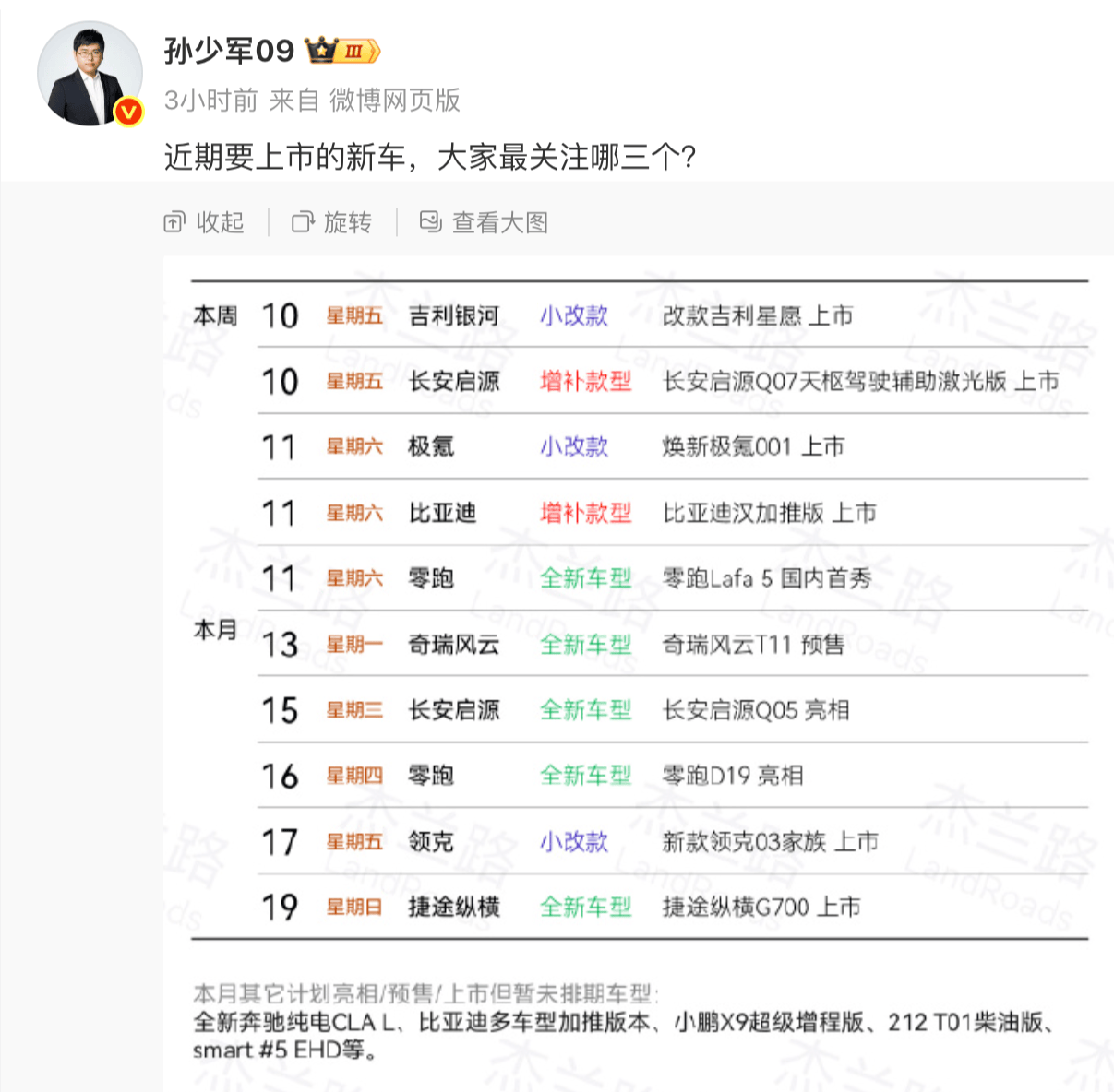 稍早前,该博主消息称,10月11日,零跑Lafa5国内首秀;全新旗舰之作零跑D19将于10月16日全球首秀。根据产品定位,这款车将是零跑汽车最大、最高端的SUV,属于主打豪华的D系列。