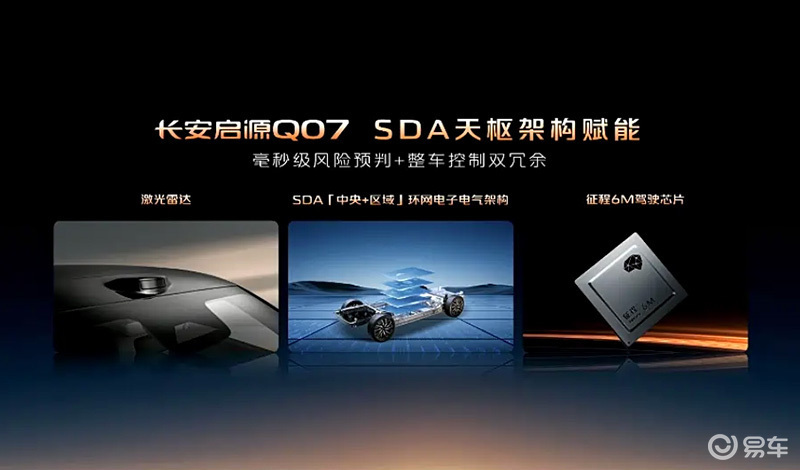 此次上市的长安启源Q07天枢智能激光版是新增车型,并延续了现售车型的整体造型和设计,最大不同的是在车头的顶部配备了1颗探测距离200m的激光雷达,再结合车身其他处的3颗毫米波雷达、11颗高清摄像头、12颗超声波雷达,以及算力高达128Tops的地平线征程6M驾驶芯片、长安汽车自研的天枢智能驾驶辅助系统,具备了更高阶的辅助驾驶功能、全场景辅助泊车功能等,能让碰撞风险降低25%,风险预判能力提升29%。