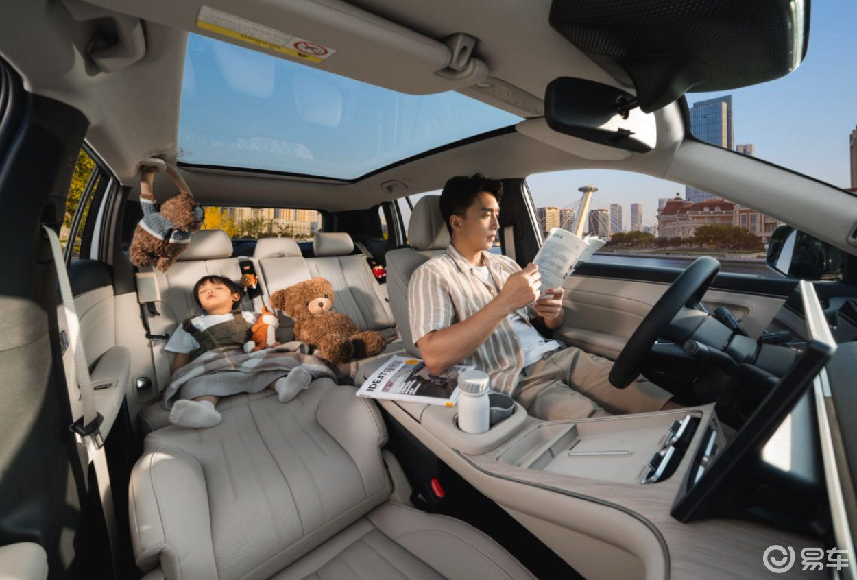 在舒适性上,i60堪称“移动的舒享客厅”。后排座椅靠背支持20度无级调节,最大137°的角度几乎可以半躺。同级首搭的后排小桌板承重达10公斤,既能作为孩子的临时书桌,也能充当父母的移动茶台。母婴级环保座舱、8点式按摩座椅、以及同级最大的全景天幕,共同营造出一个健康、温馨、开阔的驾乘环境,让每一次出行都成为享受。