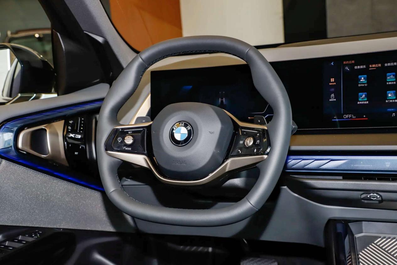 宝马X3的内饰比较豪华舒适,中控台前方配备了带换挡功能的皮质方向盘,搭配电子挡把,操控方便。智能车机集成了12.3英寸彩色全液晶仪表盘、14.9英寸中控屏,其中中控屏采用iDrive操作系统,支持4G网络、面部识别、语音识别、应用下载等功能。其次,车内还配备了自动防眩目内后视镜、多色氛围灯、主动降噪系统等配置。