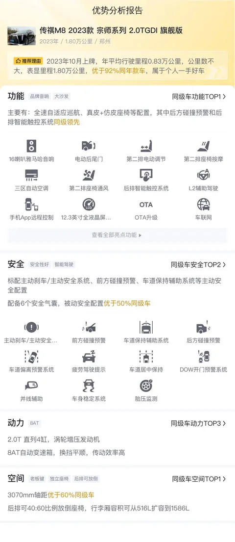 综上所述的新车含税价、用车成本、市场行情、优势分析、同款比价等数据仅供参考。在配置部分,因为二手车非标品,车辆可能会存在配置改装的情况,具体车况信息需要线下结合车辆实际情况进行综合参考。