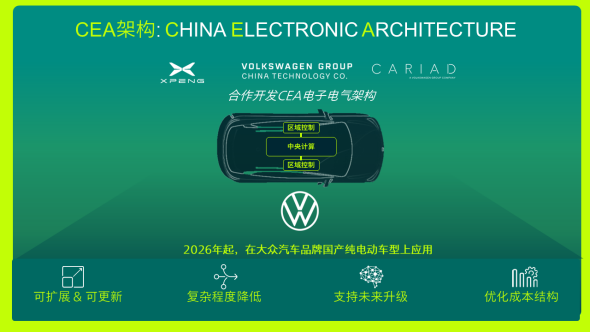 具体来看,大众与小鹏合作打造的这个CEA架构,其实是基于小鹏EEA3.5架构深度定制优化而来,其核心设计理念就是中央计算机与区域控制深度融合、软硬件完全解耦和全动力类型适配。