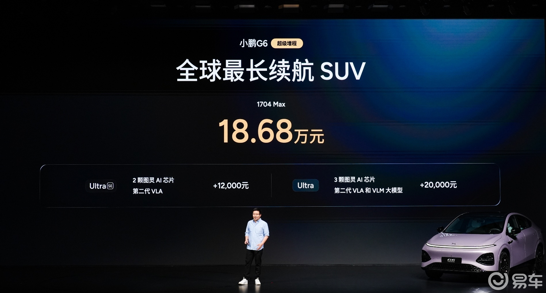 最后说价格。G6超级增程1704 Max版官方指导价18.68万元,可选装两个智能升级包:加1.2万元升级Ultra SE版(2颗图灵芯片+第二代VLA),加2万元升级Ultra版(3颗图灵芯片+第二代VLA+VLM大模型)。