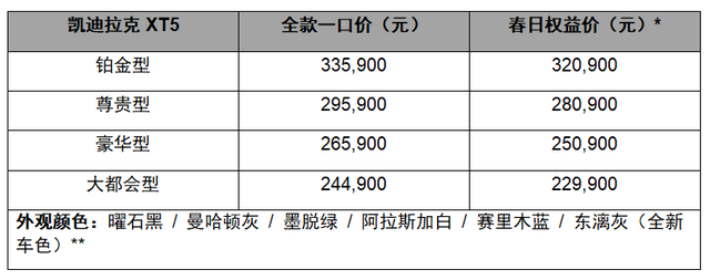 此次活动中,凯迪拉克XT5带来多重春日焕新权益:全新车色「东漓灰」正式亮相,限时选配价5000元,超跑质感触手可及;重磅升级第二代“金身计划”,在已有车损超三成免费换新的基础上限时加赠“金质权益”,三年内全车核心部件大额质损同样享受免费换新车,品质安全双重兜底。与此同时,凯迪拉克XT5推出多项春日限时福利,包括不限品牌10,000元同级最高增换购补贴、12期0息金融方案、5年内10,000元再置换补贴,叠加限时5,000元抵10,000元定金膨胀,春日限时权益价22.99万元起。