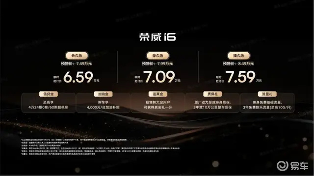 4月13日,上汽荣威推出的新款紧凑级轿车i6开始了预售。荣威i6共有三款车型,分别是长久版、豪久版和臻久版,限时抢订价为6.59万元、7.09万元和7.59万元。目前订车的用户可以享受4万元24期0利息或者60期超低利息的贷款,每辆车4000元的加油补贴和动力总成终身质保的优惠政策。另外,在5月底前锁单提车的用户还将得到足金金钞的额外大礼。