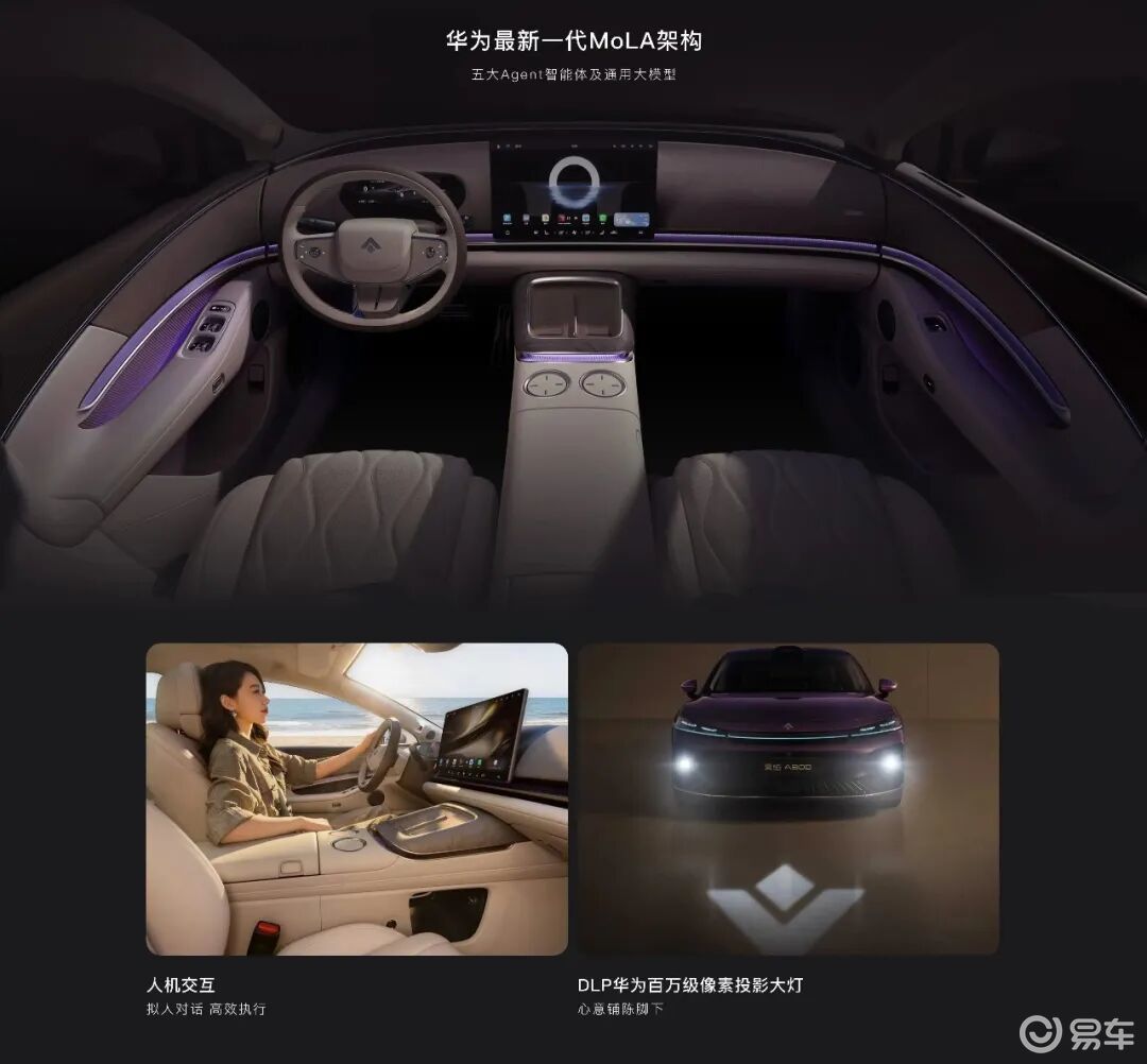 在座舱上,昊铂A800全系搭载基于MoLA架构的鸿蒙座舱HarmonySpace 5,集成五大Agent智能体,支持模糊语义控车、情感化互动等自然交互。高配车型还配备了华为乾崑云曦与HUAWEI XPIXEL联合打造的百万像素智慧投影大灯,支持自定义灯语投影。