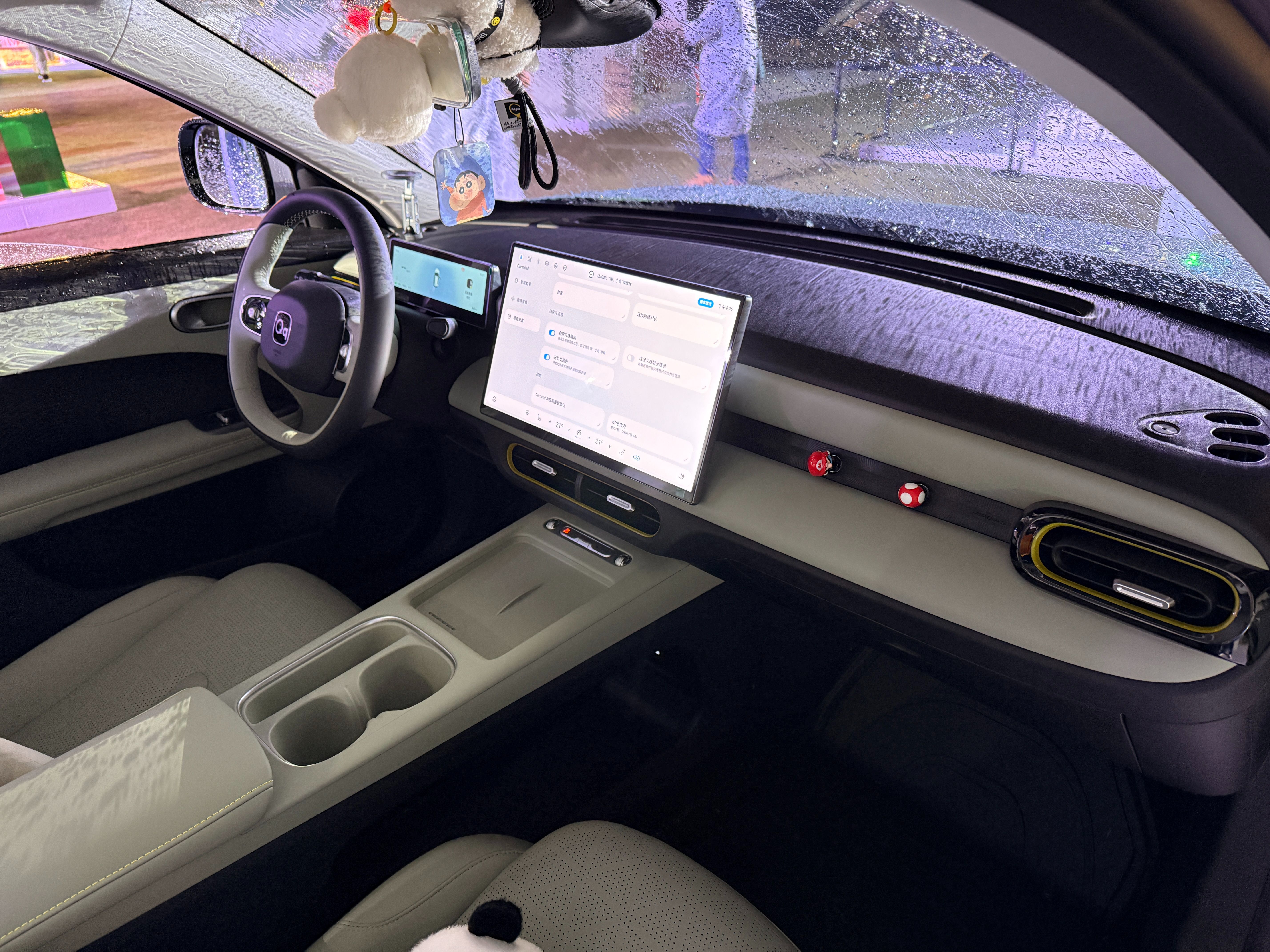 内饰方面,奇瑞QQ3的风格大家都不陌生,也是时下比较流行的设计语言了,简约风格看着很舒服,内饰有两种配色,分别是质感黑和丛林绿。中控屏尺寸为15.6英寸,尺寸不小,并且车机系统使用了高通骁龙8155芯片,响应速度不错,车机系统还搭载了Carmind大模型,支持AI自然语音畅聊等功能。车内还配备有4个螺纹扩展接口,让车内有了一定的拓展性。