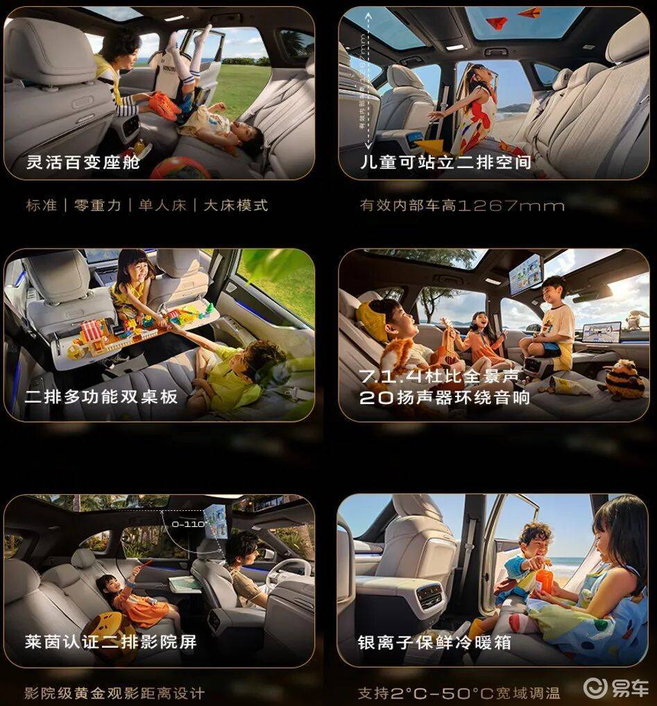 在座舱的设计上:后排的多功能双桌板、银离子保鲜冷暖箱,都是带娃出行的实用配置。后排配备独立杯架和储物袋,后备箱常规容积达到580L,放倒后排座椅后可扩展至1600L,日常放置婴儿车、行李箱、露营装备等完全够用,实用性拉满。